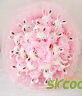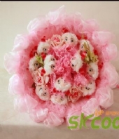 花材:9只出口韩国穿T恤hello kitty,旁边是3朵高档布艺玫瑰。