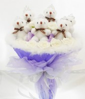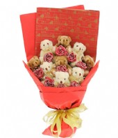 花材:9只5英寸泰迪熊,关节会活动,可以做出招手,敬礼等动作。配9朵高仿真玫瑰