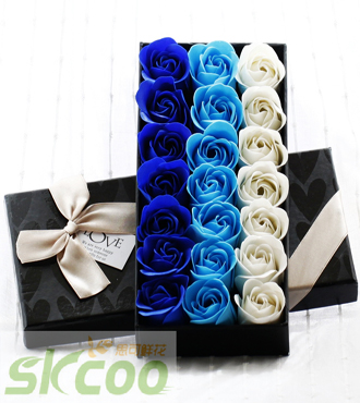 花材:7朵蓝+7朵天蓝+7朵白色香皂玫瑰花。
