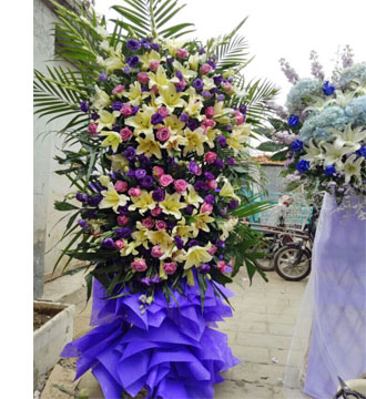 35朵黄百合,40支紫玫瑰,40支紫色桔梗,6支剑兰(洋兰)巴西木叶等配材丰满搭配。