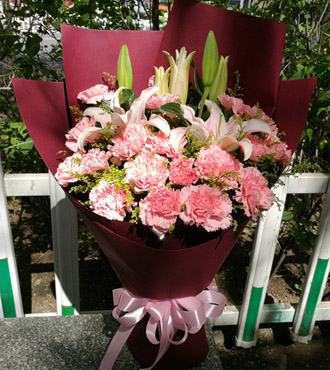 - 花材:紫红色康乃馨9枝,粉色多头康乃馨10枝