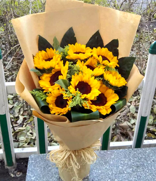 7支向日葵,2只桔梗,粉色相思梅(或粉色勿忘我)点缀。