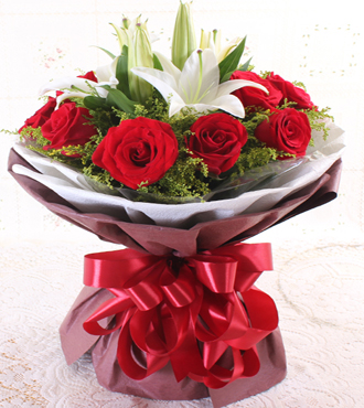 11支红玫瑰,2支多头白百合,黄莺搭配。