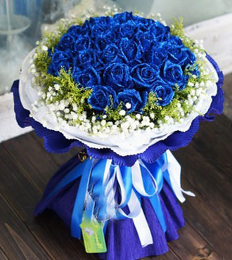 33支蓝玫瑰,黄莺满天星外围丰满搭配。