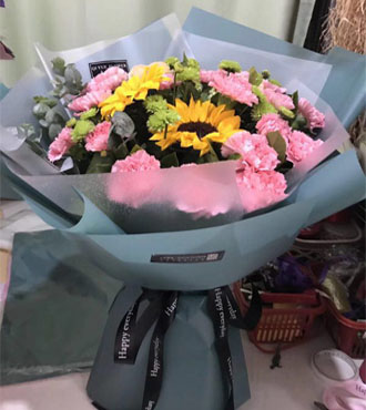 韩式混搭花束:19只粉色康乃馨,2只向日葵,绿色雏菊,尤加利搭配