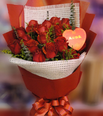 8支红玫瑰,12支红色康乃馨,16支粉色康乃馨,黄莺,绿叶搭配。