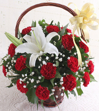 26支红色康乃馨,2支多头白百合,满天星绿叶搭配。