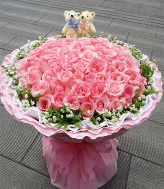 - 花材:66枝戴安娜,黄莺,满天星外围。2只小熊。
