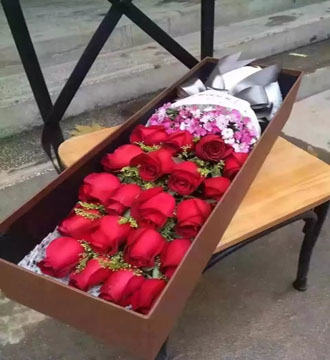 - 花材:33朵红玫瑰,满天星、栀子叶点缀