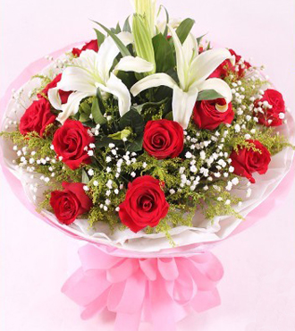 18支红玫瑰,2支多头白色百合,满天星,黄莺搭配。