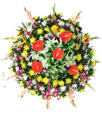 - 花材:5片红掌,3支多头白百合,36支白菊,38支黄菊,30支粉康乃馨,12支粉色剑兰,散尾葵等丰满搭配。