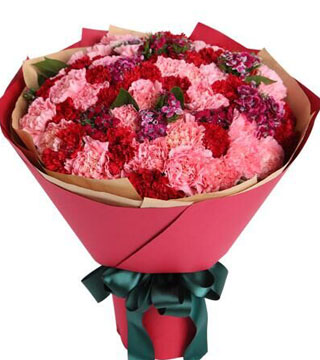 花材:10支粉玫瑰,16支红色康乃馨,30支粉色康乃馨,绿叶丰满搭配。
