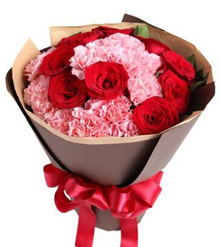花材:康乃馨+玫瑰共22枝,(13枝粉康乃馨,9枝红玫瑰),外围搭配适量绿叶。注:此款属于紧凑型包装,花束小巧精致