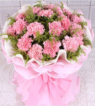 花材:21支粉色康乃馨,黄莺,满天星搭配
